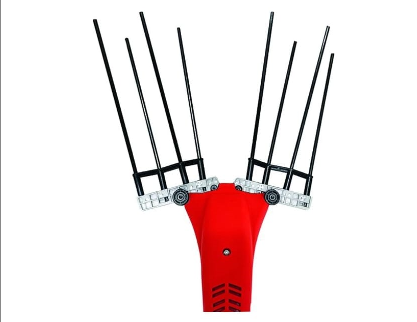 Il sistema a doppio pettine con 10 denti in carbonio garantisce una copertura ampia e una raccolta precisa, senza danneggiare i frutti o le piante. La velocità di lavoro raggiunge i 1200 colpi/minuto, mentre l’asta telescopica in alluminio si estende da 1,5 a 2,5 metri, permettendo di operare anche su alberi alti.